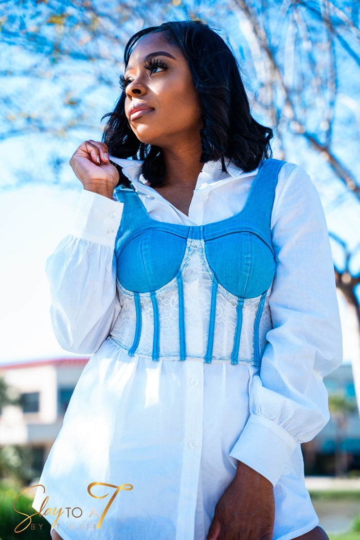 Button Down Shirt Dress With Detachable Denim And Lace Corset
